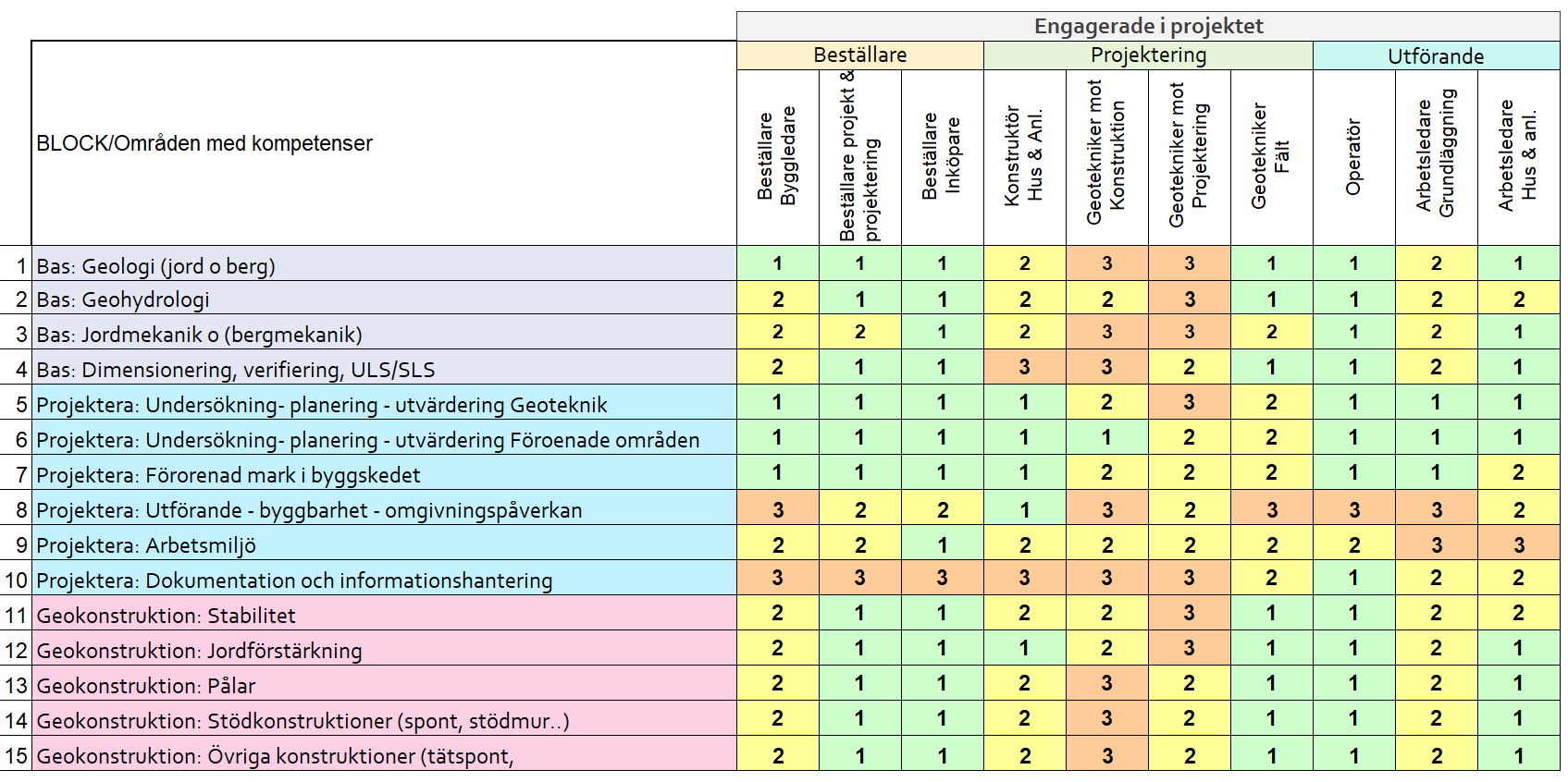 Kompetensmatrisen har gemensamt tagits fram av Svensk Grundläggning, Pålkommissionen, SGF och dåvarande IEG. Syftet med kompetensmatrisen är att: Underlätta kommunikation "Matrisen gör det möjligt att bedöma vad du kan förvänta dig att en kollega kan. Det underlättar kommunikationen mellan olika kategorier och skapar förutsättningar för att undvika missförstånd." Öka kompetens – erfarenhetsöverföring "Gemensam fokus på kompetensnivå, där gemensamma kurser skapar möjlighet till erfarenhetsutbyte. Verktyg för att planera kompetensutveckling. Illustrerar krav på fackmässighet och vad en kompetent ingenjör innebär." Gemensamt skapa kursutbud Ett verktyg för att identifiera områden där nya gemensamma branschutbildningar behöver utvecklas. Ladda ner en förenklad version via denna LÄNK. Ladda ner foldern som beskriver mer.
